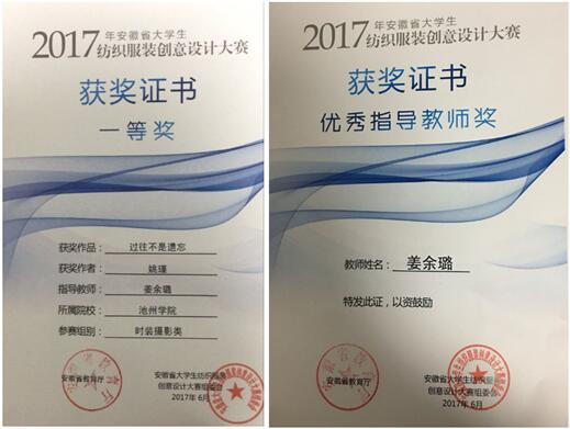 由安徽省教育厅主办、安徽工程大学承办的2017年安徽省大学生纺织服装创意设计大赛的评审工作已圆满结束,由永利官网文学与传媒学院广告学专业姜余璐老师指导、姚瑾同学创作的《过往不是遗忘》荣获“时装摄影类”一等奖,姜余璐老师荣获优秀指导教师奖。