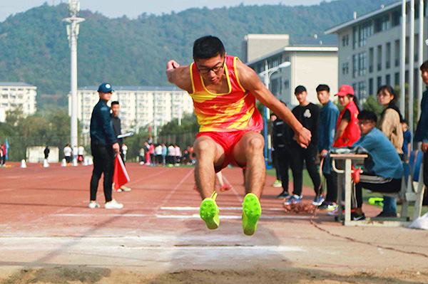 在三级跳远中,体育学院17休闲体育1班的郭振扬臂高飞,沙场称王。