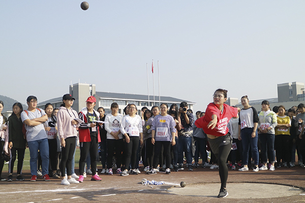 握球,预摆,推球。标准动作一气呵成,铅球在空中划出一道优美的弧线。化学与材料工程学院15材化1班的吴杨丽在女子甲组铅球比赛中收获冠军。