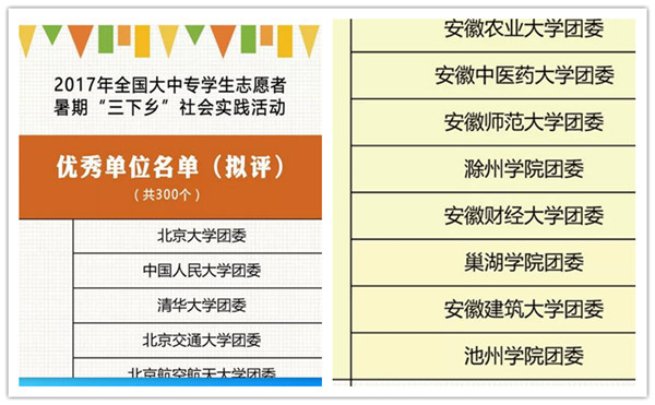 永利官网于今年6月正式启动以“喜迎十九大•青春建新功”为主题的暑期“三下乡”社会实践活动,共组建1支国家级实践团队、2支省级实践团队,60支校级实践团队,以理论普及宣传、国情社情观察、青春助力脱贫等形式开展了形式多样、内容丰富的文化科技卫生服务活动,广大师生认真踏实的服务态度、昂扬向上的精神风貌,受到了地方党委政府、企事业单位的充分肯定和当地群众的高度赞誉,也受到了中国共青团杂志、中青在线、中国公益新闻网、安徽团省委微博、安徽高校在线微信公众号、安徽省学联微信公众号、池州日报等媒体的广泛关注和报道。