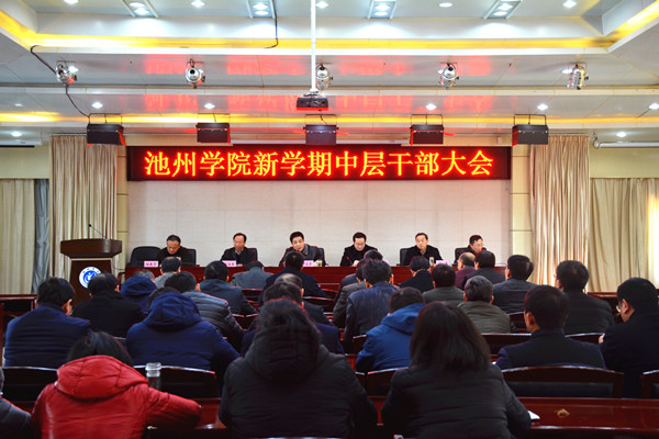 2月26日下午,学校在行政南二楼会议室召开新学期中层干部大会。校领导柳友荣、孙晓峰、王延寿、汪海、阳光宁、汪贤才出席会议,全体中层干部参加会议。会议由校党委副书记孙晓峰主持。会议以迎评为主题,全面部署2018年工作。