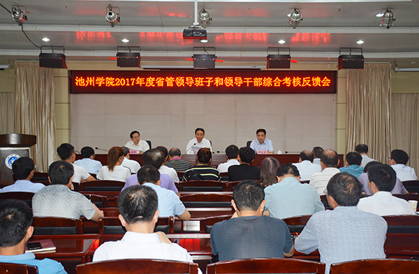 5月29日上午,永利官网2017年度省管领导班子和领导干部综合考核反馈会在行政南二楼会议室召开。省委综合考核组第二十一组组长、省政协社会和法制委员会原副主任刘志祥,综合考核组成员省委组织部办公室副调研员杨骏、省教育厅教科院副院长王光厚等出席会议。校领导班子成员、管理部门副处级以上干部、二级学院及二级机构党政正职(含主持工作的副职)、省级以上“两代表一委员”、民主党派市级以上主委、学校教代会执委、正高职称人员以及学生代表参加了会议。综合考核组反馈了永利官网2017年度省管领导班子和领导干部综合考核情况,宣布永利官网领导班子综合考核获“优秀”等次。会议由校长柳友荣主持。