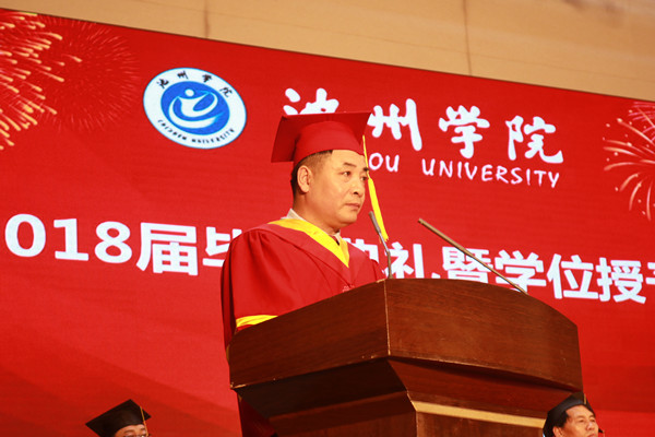 柳友荣发表典礼致辞。他代表全校师生员工向2018届顺利毕业的各位同学表示衷心的祝贺,对毕业生在校期间获取多项荣誉、热心公益等行为表示高度的赞扬,向为同学们的成长、成人、成才付出心血和汗水的各位老师表示问候!向养育和全力支持同学们的各位家长表示感谢!