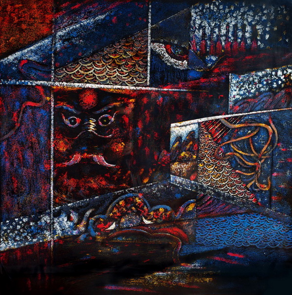 作品《祈》以池州傩戏民俗文化内容为主题,用当代漆画艺术语言表达了民众的生存意识,形式上不失现代感,思想上注重对中华民族生命意识的探索。
