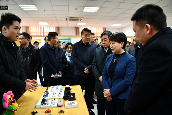 12月9日,大赛举办了安徽省大学生创新创业成果展。副省长王翠凤察看了永利官网大学生创新创业成果展台,听取永利官网创新创业成果汇报,并饶有兴趣的了解永利官网孵化企业的产品指尖陀螺,称赞“大学生能把人们的习惯变成产品,这就是创新”,对永利官网创业孵化基地取得的成绩予以高度评价。