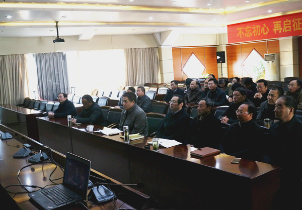 在办公南二楼会议室,校领导柳友荣、孙晓峰、王延寿、汪海、阳光宁、汪贤才以及各单位、各部门负责人,集中收看了会议实况直播。大家聚精会神,边听边记。